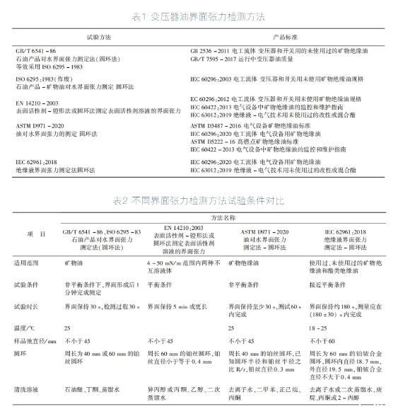 方法:不同產品標準所采用的界面張力檢測方法不同,具體如表1和2所示??梢钥闯觯鞣椒ǖ臏y量原理相同,測定絕緣油的界面張力的方法大都采用的是圓環法,主要區別就是界面形成后即非平衡條件、接近平衡條件及平衡條件下測試的保持時間不同。