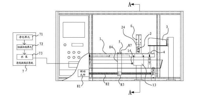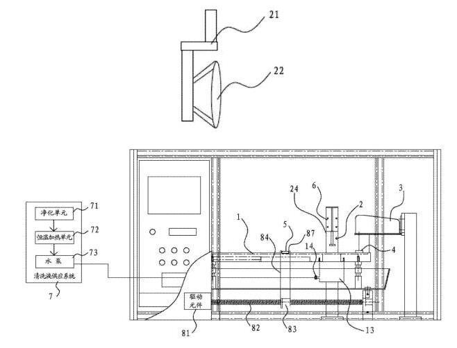 [0018]在一些實施方式中,還包括清洗液供應系統(tǒng),清洗液供應系統(tǒng)包括凈化單元、恒溫加熱單元和泵體。清洗液通過凈化單元凈化并通過恒溫加熱單元進行加熱后,再經(jīng)由泵體供應到清洗槽當中。其有益效果是,先通過凈化單元,可以預先清除掉清洗液當中可能存在的油。另外,通過恒溫加熱單元可以將清洗液加熱到一定的溫度。因為溫熱狀態(tài)的清洗液,可以實現(xiàn)更加的油脂清除能力,從而可以將樣品上的油更方便且更完全的清洗下來。