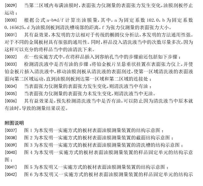 [0014]同時由于樣品固定單元是位于第一區(qū)域上方的,所以當油清洗下來的時候,首先是在第一區(qū)域的清洗液面擴散開來形成油膜。當油膜刮板從第一區(qū)域的一端向著第二區(qū)域方向運動的時候,油膜就會向第一區(qū)域運動,當?shù)谝粎^(qū)域內(nèi)聚滿油膜的時候,表面張力儀就會通過鉑金板片感應到清洗液表面張力的變化,此時油油膜刮板停止運動,計算出整個油膜的面積。為了方便計算油膜的面積,可以在清洗槽的邊沿上設(shè)置相應的刻度,同時將油膜刮板設(shè)置成與清洗槽的邊沿相垂直。最后根據(jù)公式a-b*d/f計算出油膜量,其中,a為固定系數(shù)102.0,b為固定系數(shù)0.165625,d為油膜刮板到清洗槽端部的距離,f為張力儀測量的表面張力大小。