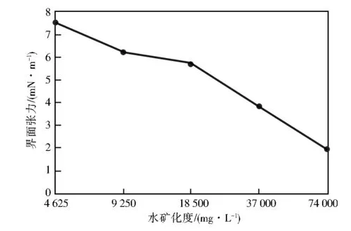 從圖3可以看出:隨著水礦化度的升高,界面張力逐漸下降。此外還可看出,在礦化度從4 625 mg/L增加到9 250 mg/L時,油水界面張力值有一個明顯下降的過程,其從7.52 mN/m降至6.23 mN/m,界面張力值減小1.29 mN/m。之后下降過程變得平緩,總體而言,從實驗結果可以看出,礦化度對于油水界面張力的影響較大。