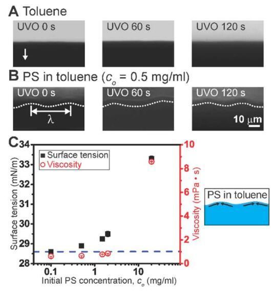 圖 2 (A) 僅通過流涂的甲苯的彎液面前端。 箭頭表示流動后退方向。 (B) 彎月面 聚苯乙烯(PS)在甲苯中通過流涂的前面。 白色的 虛線是眼睛的指南,半月板前面跟隨 k 的周期波長。 (C) 表面張力和粘度作為 初始 PS 濃度的函數(shù)。 藍(lán)色虛線表示甲苯的表面張力。 示意圖說明 可能由表面張力梯度引起的流動(由 濃度梯度)用于在彎月面蒸發(fā)前沿的甲苯中的 PS。
