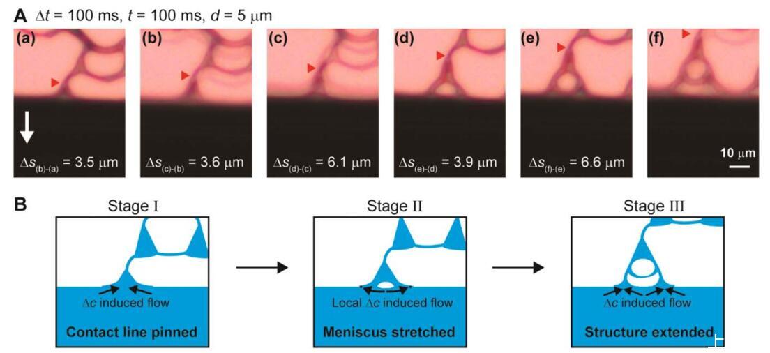 揭示自發(fā)結(jié)構(gòu)形成的細(xì)節(jié) 超支化結(jié)構(gòu),我們采用原位顯微鏡[圖。 3(A)]。 視頻圖像顯示超分支 結(jié)構(gòu)通常分三個階段形成[圖。 3(B)]。 我們注意到,由于我們的彎液面的動態(tài) 過程中,我們很難測量波長 動態(tài)彎液面。 在第一階段,手指平行于 由于馬蘭戈尼不穩(wěn)定性而出現(xiàn)流動方向 和摩擦。 重要的是,三角形半月板將手指連接到半月板前部。 由于手指是 與本體溶液相比,PS 的濃度更高, 手指的表面張力相對較高,拉入 本體溶液,具有較低的表面張力。 這一步是 如圖3(B)(a)所示。