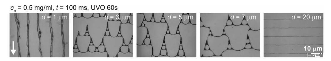 圖 4 PS 模式作為設(shè)定距離 d 的函數(shù),具有常數(shù) co (co 5 0.5 mg/mL)、t (t 5 100 ms) 和 UVO 暴露時間 (60 秒)。 白色箭頭表示流動后退方向。