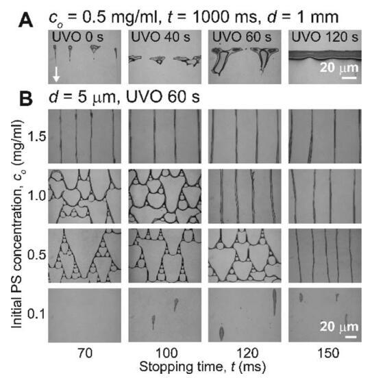 圖 5 (A) PS 圖案作為 UVO 曝光時間的函數(shù) 具有恒定的初始 PS 濃度 (co 5 0.5 mg/mL)、停止時間 (t 5 1000 ms) 和設(shè)置距離 (d 5 1 mm)。 這 白色箭頭表示流動后退方向。 (二) 聚苯乙烯 模式作為 co 和 t 的函數(shù),同時保持不變 距離 (d 5 5 lm) 和 60 秒的 UVO 曝光時間。