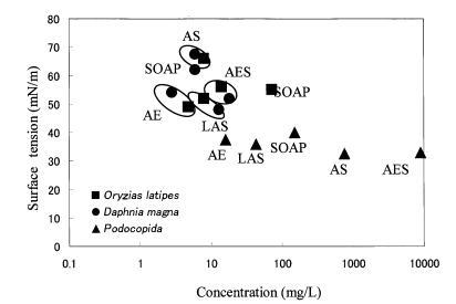 SOAP 的毒性值繪制在圖 8 中的表面張力曲線上。 oryzias latipes 和 podociida 可以確定為大約 55 分別為 mN/m 和 40-45 mN/m。 兩個范圍的gtox 然而,獲得了 daphnia magna 的值:73 mN/m 在水硬度為 5 ppm 和大約 60 mN/m,水硬度為 25-625 ppm。
