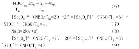 熔體表面張力與熔渣結(jié)構(gòu)的聚合程度密切相關(guān)。連鑄結(jié)晶器保護(hù)渣屬于硅酸鹽,硅酸鹽熔體中含有不同聚合程度的硅氧陰離子團(tuán)。熔渣結(jié)構(gòu)的聚合程度用符號“NBO/TSi”表示,其計(jì)算公式如式(4)所示。NBO/TSi值越小,說明熔體聚合程度越高。將預(yù)熔渣和靜滴法測定后的渣樣成分分別帶入到式(6)中,計(jì)算結(jié)果如表2所示。從表中可以看出,靜滴法測定后渣樣的NBO/TSi值小于預(yù)熔渣的NBO/TSi值,說明靜滴法測定后的渣樣熔體結(jié)構(gòu)聚合程度高于預(yù)熔渣熔體結(jié)構(gòu)聚合程度。這是由于F-能降低熔渣結(jié)構(gòu)的聚合程度,將高聚合程度的硅氧陰離子團(tuán)逐漸解聚成低聚合程度的硅氧陰離子,同時Na2O電解出O2-,O2-的出現(xiàn)亦可降低熔體的聚合程度,反應(yīng)式見(7)~(9):