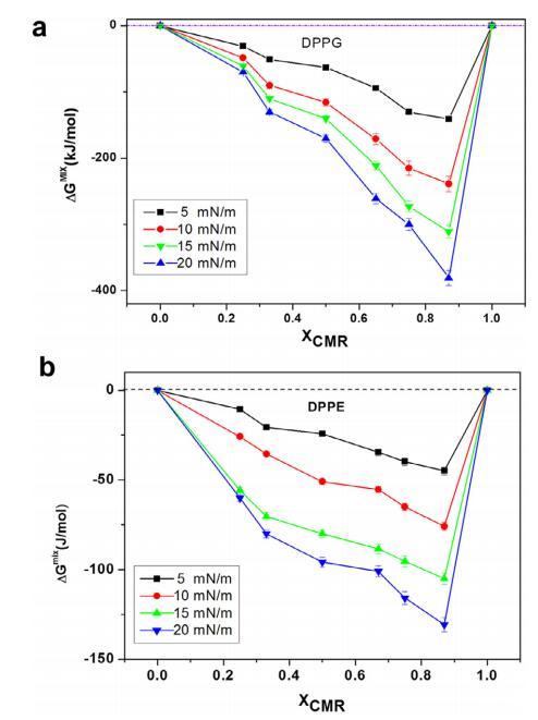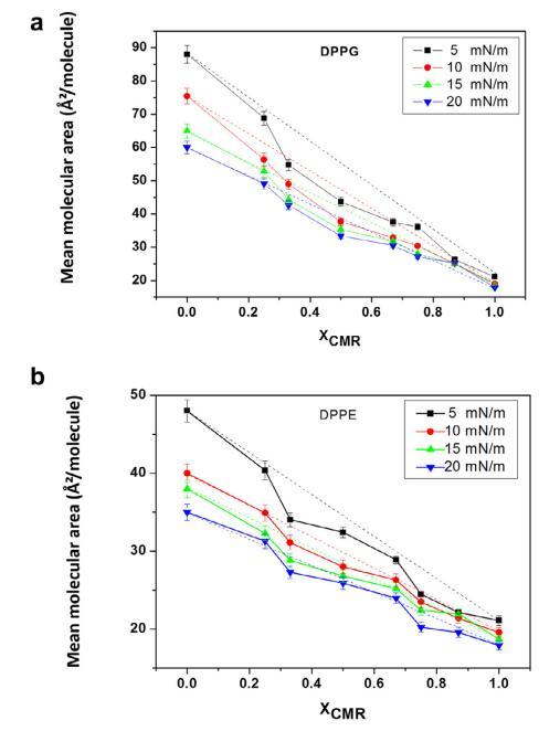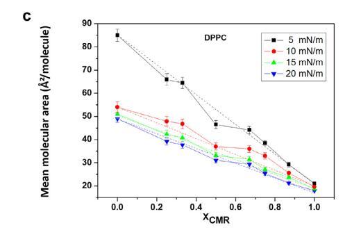 純和混合單層的 pA 等溫線與分子面積的關(guān)系如圖 1 所示。CMR/DPPG 等溫線顯示出與純 DPPG 脂質(zhì)相似的趨勢(shì)(圖 1a)。 相似相 對(duì)所有 CMR/DPPG 混合物都觀察到了轉(zhuǎn)變。 DPPG 和 DPPC 顯示崩潰壓力 (DPcoll) 為 52 mN.m-1 次方和 60 mN.m-1次方 , 分別。 一個(gè)過(guò)渡 (p ffi 3 mN.m-1次方 ) 從液體 發(fā)現(xiàn)純 DPPE 單層膨脹為凝聚相 與 D. coll 在 ffi55 mN.m-1次方 . 為 D. coll 獲得的值 純脂質(zhì)與文獻(xiàn)一致(Vollhardt 等人, 2000; 諾沃塔斯卡等人,2014 年)。