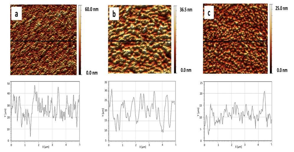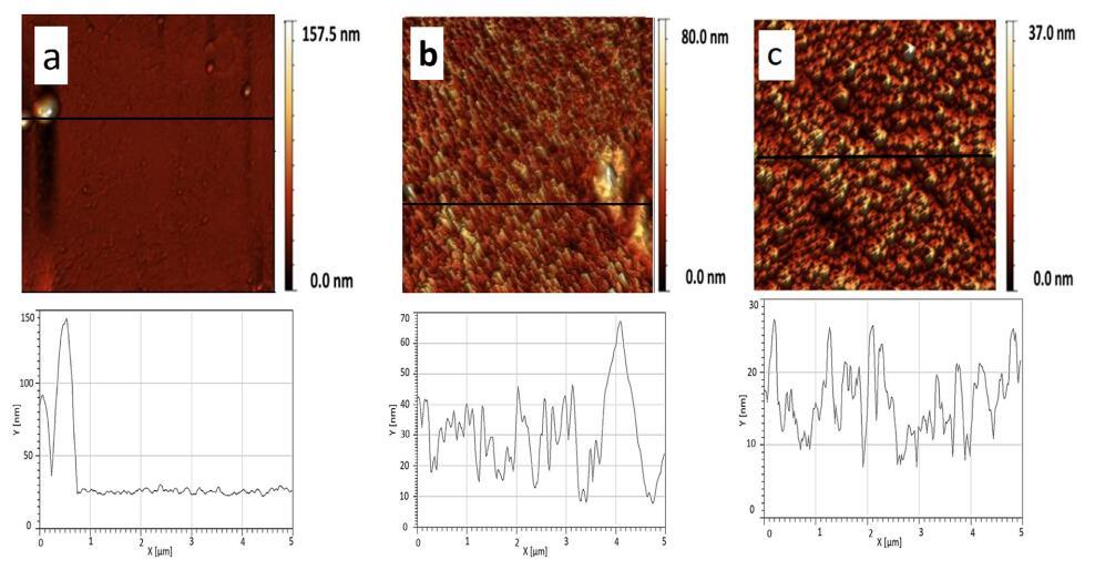 圖 9 顯示了純磷脂單層的 AFM 圖像 在 p = 20 mN/m 時(shí)轉(zhuǎn)移。 純磷脂顯示出均勻的 均方根 (rms) 等于 0.219 nm 的圖案, DPPG、DPPE 和 DPPC 分別為 0.060 nm 和 0.054 nm (圖 9)。 我們獲得了 rms ~ 0.045 nm (XCMR = 0.87) 相當(dāng)于 光滑的單層形貌(圖 10a)。 另一方面, CMR/DPPE 和 CMR/DPPC 薄膜對(duì)應(yīng)于粗糙表面 rms 分別為 0.1754 nm 和 0.072 nm(圖 10b 和 c)。 測(cè)量重復(fù)三次,rms 的標(biāo)準(zhǔn)偏差約為 5%。