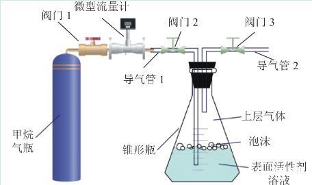 采取自主研發(fā)的泡沫對(duì)氣體緩釋效應(yīng)試驗(yàn)裝置進(jìn)行試驗(yàn),試驗(yàn)裝置如圖2所示。將250 mL表面活性劑溶液置于密閉錐形瓶,使用微型流量計(jì)控制甲烷氣體勻速向表面活性劑溶液中以300 mL/min速度通入50 mL氣體。試驗(yàn)具體步驟如下: