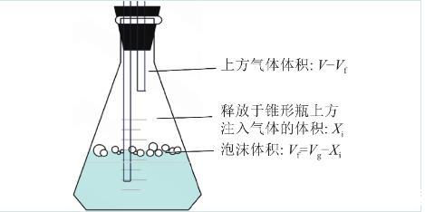 計(jì)算表面活性劑泡沫對(duì)氣體的緩釋效應(yīng)時(shí),應(yīng)考慮到空氣中本來(lái)就含有氣體占比。假設(shè)錐形瓶上方由于注入氣體釋放出的組分含量為Xi;原有大氣中注入氣體占比為ai;通入氣體體積為Vg,泡沫層體積Vf=Vg?Xi,錐形瓶上方除去泡沫的氣體空間體積為V?Vf。推理計(jì)算公式如(2)所示。計(jì)算模型圖如圖3所示。