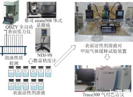 試驗(yàn)流程如圖1所示。將兩種表面活性劑配置質(zhì)量分?jǐn)?shù)為0.01%、0.02%、0.05%、0.1%、0.15%的溶液,使用QBZY全自動(dòng)表面張力儀對(duì)不同質(zhì)量分?jǐn)?shù)表面活性劑溶液以及去離子水進(jìn)行表面張力測(cè)量,NDJ-9S數(shù)顯粘度計(jì)測(cè)表面活性劑溶液黏度,注氣法檢測(cè)溶液泡沫性質(zhì),蔡司stemi508體式顯微鏡觀察泡沫形態(tài)。上述基礎(chǔ)參數(shù)測(cè)定結(jié)束后,使用自行研制的表面活性劑溶液對(duì)甲烷緩釋試驗(yàn)裝置進(jìn)行泡沫對(duì)甲烷緩釋效應(yīng)影響試驗(yàn),并采用Trace300氣相色譜儀定量檢測(cè)分析。