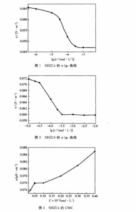 b.SHZ16的臨界膠束濃度為比SHZ14要低,這是由于SHZ16的碳氫鏈比SHZ14稍長,導致疏水基之間的相互干擾減少,造成在表面的自組織能力增強,表面吸附能力有所升高,從而使臨界膠束濃度降低。