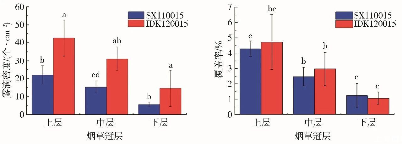 如圖4所示,與SX110015噴頭相比,IDK120015噴頭可提高藥液霧滴密度,煙草上、中、下冠層分別提高92.9%、101.6%和160.7%;在煙草上、中冠層藥液霧滴覆蓋率分別提高10.0%和20.2%,但在煙草下冠層藥液霧滴覆蓋率則降低13.8%。這是由于IDK120015噴頭孔徑小,藥液霧滴粒徑更細,而SX110015噴頭的噴霧藥液霧滴的穿透性更強。因此,在使用時應根據(jù)天氣條件和防治對象選擇合適類型的噴頭。