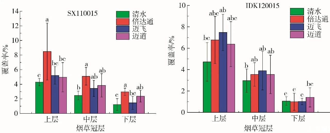 如圖3所示,采用SX110015噴霧時,添加助劑能夠顯著提高藥液霧滴在煙草上、中和下冠層的覆蓋率。其中,倍達通助劑的效果最為顯著,分別提高97.9%、106.1%和141.5%,而邁道對煙草下層的藥液霧滴覆蓋率提高92.7%。