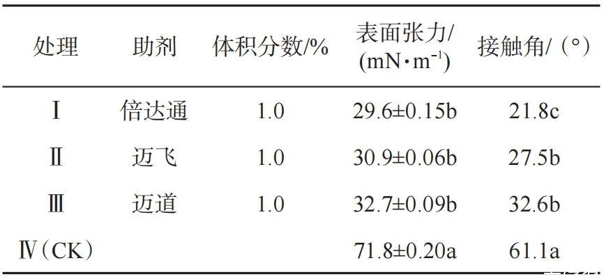 2.1添加助劑對藥液表面張力和接觸角的影響