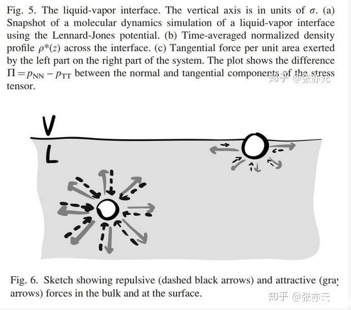 借鑒Gibbs的開創性工作,我們可以將表面張力理解成因兩本體相間界面存在導致的額外表面能。液-氣界面附近的液體分子所處的環境與本體中的分子不同,這種差異經常被人用圖1的示意圖表現,即近乎一半的分子間引力缺失,這導致自由能的增加,這是熱動力學的觀點。