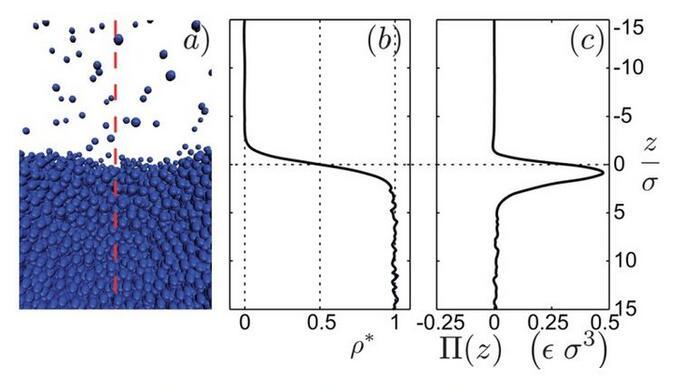 當分子間距較小時,斥力為主,分子間距較大時,引力為主。在斥力與引力平衡時,Lennard-Jones勢能最小。現在,我們就可以來詳細地考慮液-氣界面了。圖5a是通過分子動力學仿真得出的液-氣界面照片,對應的時間平均密度分布圖是圖5b。從高密度的液體到低密度的氣體發生在一個幾個分子厚度的窄區域。為了確定毛細力,我們沿垂直界面方向將系統分為兩個子系統(圖5a)。考慮左邊子系統對右邊子系統的單位面積的作用力,即應力,在豎直方向上的分布。這個力有兩個來源:壓力P和額外壓力Π(圖5c)。圖5c表明有個力局部存在于界面附近,其實這個力就是表面張力,且這個力范圍和密度突變的范圍很相似。這說明表面張力的確是一個真實的力,而不僅僅是表面能的一種純數學描述。既然我們發現在界面附近的確局部存在一個平行的力,那我們回到問題1,為什么表面張力平行于界面而不是垂直于界面?我們注意到圖1僅僅描繪了分子間引力作用。更全面的圖應該如圖6所示,包含了引力與斥力作用。在遠離界面的液體本體內,由于液體分子周圍的完全對稱性,分子的受力完全平衡。但是,靠近界面附近的地方,上下對稱性被打破。為修復豎直方向的力平衡,向上的斥力需平衡向下的引力。而在平行于界面的方向,對稱性仍然存在,平行于界面方向的力平衡仍然存在。這就可以存在一種情況,引力作用的強度與斥力作用的強度不同。實際上,在界面附近的水平方向上,引力作用比斥力更強,這產生了表面張力。
