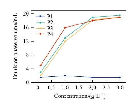 圖7示出4種表面活性劑對液體石蠟的乳化能力隨濃度的變化關系。P1由于較短的聚氧乙烯鏈段導致較差的親水性和乳化能力。隨著濃度的增加,P2,P3和P4的乳化性能逐漸提升,這是由于吸附在油/水界面上的表面活性劑分子數量隨著濃度的增加而增多,使分子形成的聚集體在界面處排列得更緊密,生成更致密、更剛性的油/水界面膜,從而使乳狀液也更加穩定。具有長聚氧乙烯鏈的表面活性劑乳化性能更好,這是因為聚氧乙烯鏈的空間排斥作用可以防止乳液液滴聚并,有利于穩定液滴。