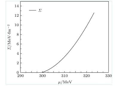 利用薄壁近似,圖2給出了當T=Tc時,夸克強子一級相變的表面張力隨夸克化學(xué)勢的變化。可知在一級相變區(qū)域,當化學(xué)勢增大時,強子相的表面張力也隨著化學(xué)勢增大。當溫度接近零時,強子夸克相變的表面張力約為12.6 MeV/fm2.在T→0的情況,本文理論預(yù)言與文獻一致,但該文獻只是考慮T=0的冷夸克物質(zhì)的夸克強子一級相變。