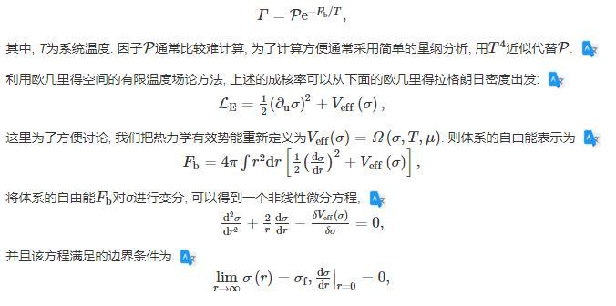 在偽真空的環(huán)境下,大小不一的真真空泡泡,由于量子漲落和熱漲落隨機出現(xiàn)并消失,直至泡泡的半徑大于等于臨界半徑,然后這些泡泡就會一直膨脹下去,完成一級相變的相變過程,并把多余的體系自由能以相變潛熱的形式釋放到環(huán)境中。基于這個機制,單位時間單位體積的臨界泡泡成核率可以表示為