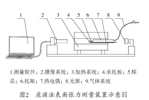 座滴法表面張力測(cè)量裝置結(jié)構(gòu)如圖2所示,由測(cè)量軟件、攝像系統(tǒng)、加熱系統(tǒng)、承托板、樣品、托架、熱電偶、光源、氣體系統(tǒng)構(gòu)成。