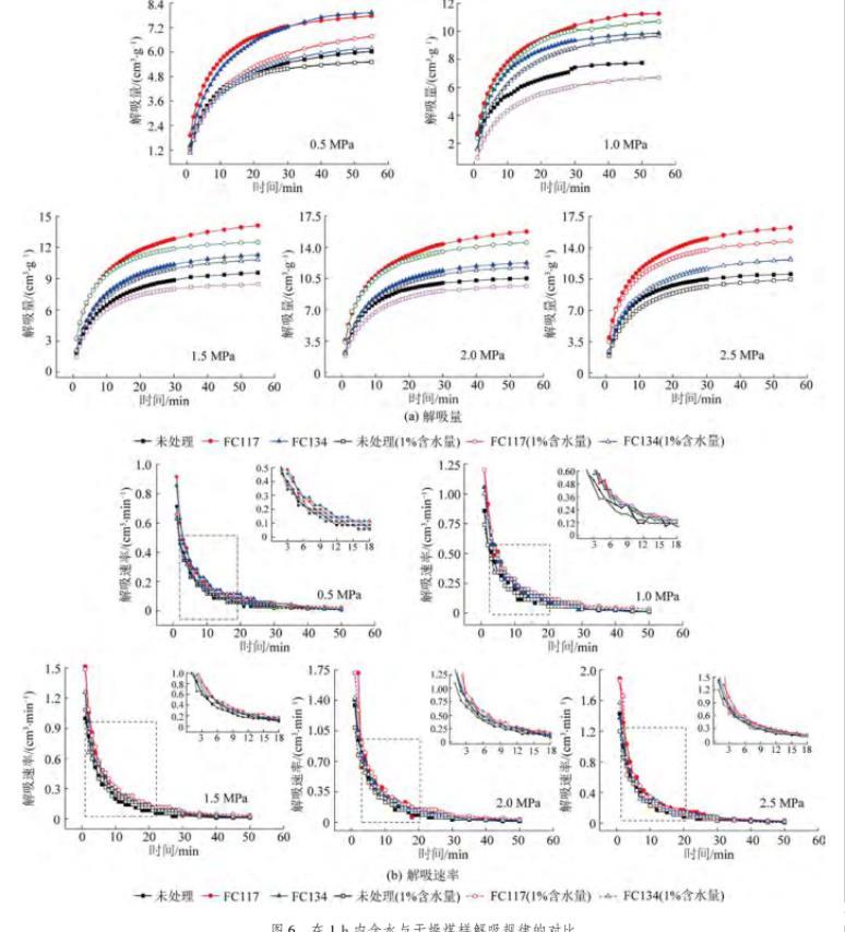 為了得到氣潤濕反轉劑處理前后含水(1%含水率)煤樣的解吸規律,依次對不同吸附平衡壓力條件下的煤樣進行解吸試驗,通過對比干燥與含水煤樣的解吸量和解吸速率,進而定量分析氣潤濕反轉劑消除水鎖效應,如圖6所示。