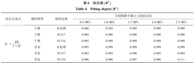 由表6可知,利用王佑安式擬合不同平衡壓力條件下的解吸量與時間關系曲線,得到曲線的擬合度。其中,氣潤濕反轉劑處理前后含水煤樣的擬合效果最好,擬合度均大于0.99。在干燥煤樣中,FC134處理后的煤樣擬合度最好,不同吸附平衡壓力條件下的擬合度均大于0.99;其次是未處理和FC117,擬合度也比較好,除去未處理煤樣中吸附平衡壓力為1.0 MPa,其余均在0.98以上。
