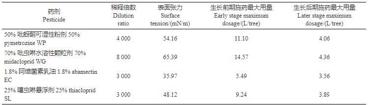 表3為4種常用農藥制劑在推薦使用倍數下對蘋果樹的最大施藥量。從表中可以看出,在蘋果樹生長前期施藥的最大用量遠高于在生長后期施藥。考慮到目前果園中使用的大容量噴霧器械多為手持柱塞泵式機動噴霧機,霧滴粒徑均一性較差,加之人為因素可能導致的藥液無法均勻覆蓋全樹,再結合張鵬九等在關于不同藥械防治蘋果園桃小食心蟲影響的研究中每株樹推薦使用藥液量為3.5 L,得出在果樹前期推薦藥液的表面張力應在35 mN/m以下,后期應在60 mN/m以上,便于實際操作。