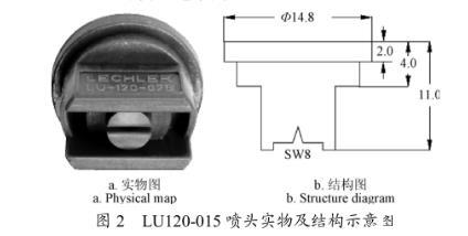 試驗噴頭為德國LECHLER公司生產(chǎn)的空氣誘導(dǎo)噴頭IDK120-025和多量程平面噴頭LU120-015,其結(jié)構(gòu)及尺寸如圖1和圖2所示。