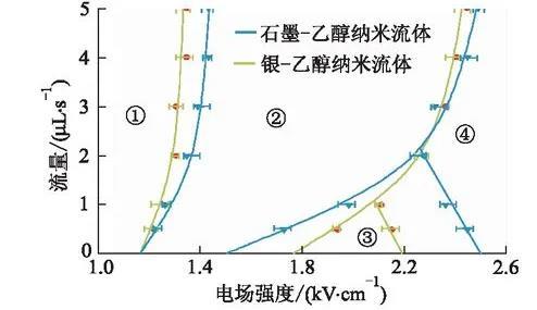 流量是影響納米流體霧化特性的另一重要參數(shù)。尋找在較大流量下依然能保持穩(wěn)定霧化效果的區(qū)間,對(duì)工業(yè)應(yīng)用具有十分重要的意義。質(zhì)量分?jǐn)?shù)為0.1%的納米流體在不同流量下霧化模式隨電壓的變化區(qū)間如圖3所示,區(qū)間①為滴狀模式,區(qū)間②為紡錘模式,區(qū)間③為錐射流模式,區(qū)間④為多股射流模式。相同電場(chǎng)強(qiáng)度下隨著流量的增加,單位體積流體荷電量也隨之減小。因此,流體從滴狀模式進(jìn)入紡錘模式所需電場(chǎng)強(qiáng)度逐漸升高(圖3區(qū)間①→②)。由圖3區(qū)間②可知,隨著流量的增大紡錘模式所占區(qū)間逐漸增大。低流速(<2μL·s-1)狀態(tài)下,電場(chǎng)強(qiáng)度增大,流體表面集聚大量電荷,致使液體表面張力降低,霧化模式也就從紡錘模式逐步向錐射流模式過渡(圖3區(qū)間②→③)。納米流體的錐射流模式僅僅發(fā)生在流量低于2μL·s-1時(shí),并且隨著流量的增大,錐射流模式所在區(qū)間迅速減小直至消失(圖3區(qū)間③)。電場(chǎng)對(duì)流體荷電的能力有限,流量的增加使得流體不穩(wěn)定性增大,大部分電荷無法聚集至液錐表面,從而導(dǎo)致錐射流模式隨著流量的增大,其霧化區(qū)間迅速消失。