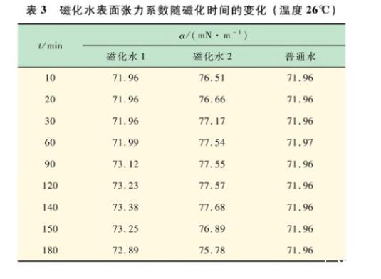 表3磁化水表面張力系數隨磁化時間的變化(溫度26℃)