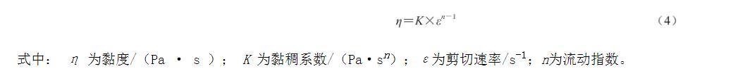 式中:η為黏度/(Pa·s);K為黏稠系數(shù)/(Pa·sn);ε為剪切速率/s-1;n為流動指數(shù)。