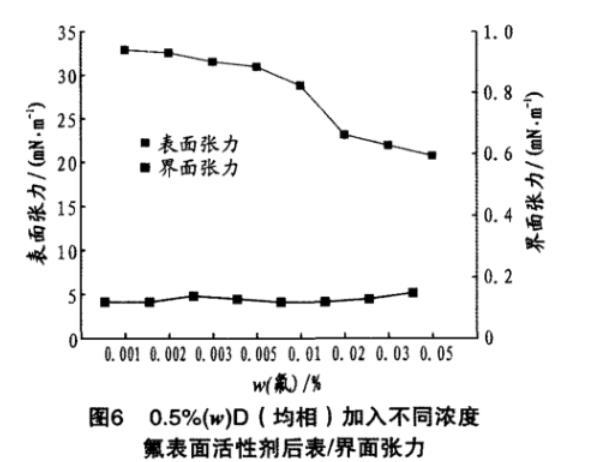 0.5%(w)D(均相)加入不同濃度氟表面活性劑后表/界面張力見圖6。