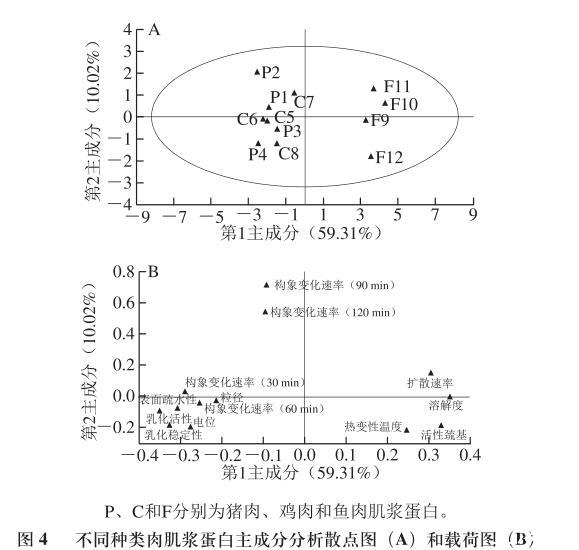 圖4不同種類肉肌漿蛋白主成分分析散點(diǎn)圖(A)和載荷圖(B)