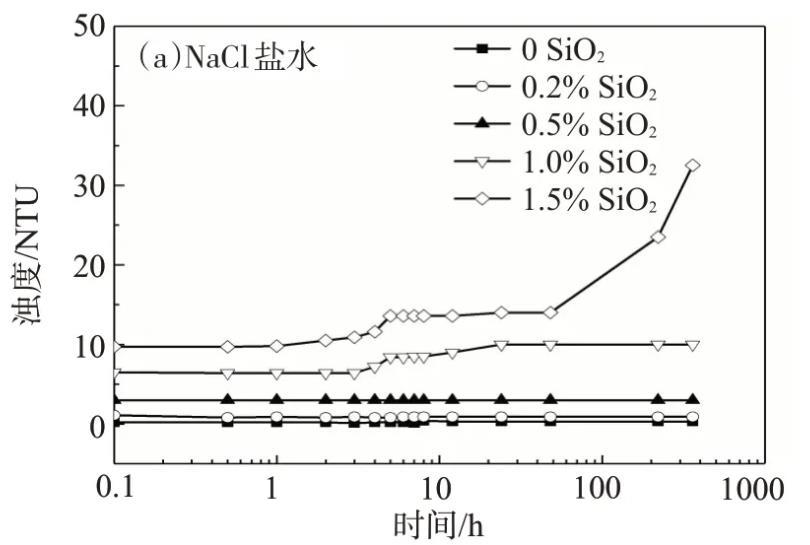 用模擬地層水配制的納米SiO2/SDS體系經歷了澄清透明-渾濁-沉降的3個階段,靜置初始,納米SiO2質量分數為0.5%的體系的濁度不隨時間的延長而變化,表明此時體系穩定;靜置1 h后,濁度明顯增加;靜置6 h后,體系的濁度又恢復到了初始值,由于實驗測試的是樣品上半部分的濁度,說明此時體系已經完全沉降。