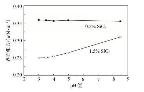 當SiO2質量分數為1.5%時,納米SiO2/SDS體系靜置不久納米SiO2即聚集在一起,使得SiO2與SDS之間的排斥作用減小,隨著pH值的降低,水化作用力及H+保護層的形成使得納米SiO2聚集的幾率大大降低,SiO2顆粒在體系中分散較均勻,因此SiO2與SDS之間的排斥作用增大,體系降低油水界面張力的能力增強。當SiO2質量分數為0.2%時,納米SiO2/SDS體系具有較好的穩定性,pH值的下降對體系降低油水界面張力的能力基本無影響。