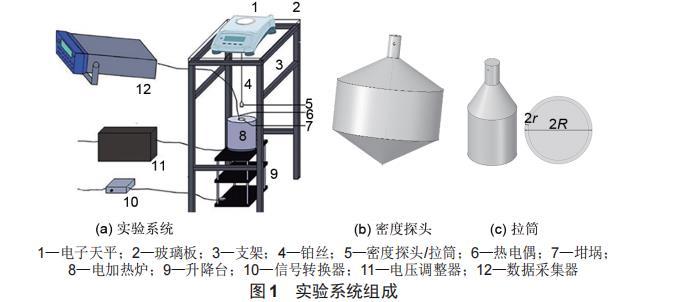 實(shí)驗(yàn)系統(tǒng)由測(cè)量系統(tǒng)、加熱系統(tǒng)、控制系統(tǒng)和支撐系統(tǒng)組成。實(shí)驗(yàn)系統(tǒng)如圖1(a)所示。測(cè)量系統(tǒng)由高精度電子天平(型號(hào)為METTLER TOLEDO ME104,精度為0.1 mg)、數(shù)據(jù)采集器(型號(hào)為key sight 34872 A)、熱電偶(K型)、探頭組成;加熱系統(tǒng)由電加熱爐和坩坩堝堝組成;控制系統(tǒng)由電壓調(diào)整器(型號(hào)為T(mén)6-1-4-060 DC)、智俊軟件組成;支撐系統(tǒng)由升降臺(tái)、鋼架、玻璃板組成。