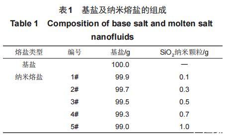 本實(shí)驗(yàn)所用材料為NaNO3、KNO3和30nm的SiO2納米顆粒。所有實(shí)驗(yàn)材料在制備納米熔鹽之前均需要經(jīng)過(guò)干燥處理。使用型號(hào)為Mettler Toledo ME104,精度為0.1mg的電子天平對(duì)干燥后的熔融鹽和納米顆粒進(jìn)行稱(chēng)量。見(jiàn)表1,按照比例將基鹽及納米顆粒進(jìn)行稱(chēng)量后,利用高溫熔融法將SiO2納米顆粒均勻分散至基鹽中,將制備好的納米熔鹽樣品放入干燥箱中保存?zhèn)溆谩?