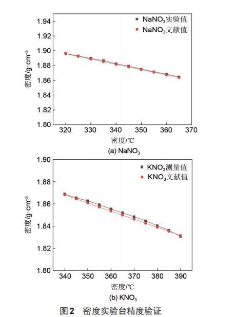 密度實(shí)驗(yàn)臺(tái)精度驗(yàn)證如圖2所示。密度實(shí)驗(yàn)臺(tái)測(cè)得NaNO_3、KNO_3的密度與參考文獻(xiàn)上給出的密度值變化趨于一致,并且最大偏差值低于0.12%,考慮到文獻(xiàn)值存在的誤差,本實(shí)驗(yàn)臺(tái)的密度測(cè)量精度滿足實(shí)驗(yàn)要求。