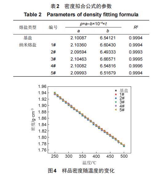 文獻(xiàn)中提出,在熔融鹽中加入SiO2納米顆粒后,由于分子間作用力和納米熔鹽配制過程中的攪拌作用,熔融鹽和納米顆粒在熔鹽體系中會(huì)形成一種納米云核。納米云核中納米顆粒被大量的熔融鹽包裹,此時(shí)SiO2納米顆粒的密度對(duì)納米云核的密度影響可以忽略不計(jì),納米云核的密度始終與基鹽的密度保持一致。