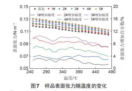 樣品的表面張力值隨溫度變化如圖7所示。可以看到,在250~480℃內(nèi),基鹽的表面張力在0.1044~0.1188N/m,表面張力隨溫度的升高呈下降趨勢。1#納米熔鹽的表面張力在0.1059~0.1219N/m,對數(shù)據(jù)進(jìn)行擬合后,擬合系數(shù)在0.995以上,擬合程度較好。2#納米熔鹽的表面張力在0.1117~0.1301N/m,擬合系數(shù)為0.996,隨溫度變化的趨勢和基鹽及一般熔鹽表面張力的變化趨勢保持一致,均隨溫度的升高呈下降趨勢。3#和4#納米熔鹽的表面張力在0.1075~0.1232 N/m和0.1085~0.1265 N/m,擬合系數(shù)都在0.994以上,其中4#納米熔鹽的擬合系數(shù)與2#納米熔鹽的擬合系數(shù)相同,均為0.996,擬合程度最好。5#納米熔鹽的表面張力在0.1115~0.1305N/m,擬合系數(shù)為0.991。