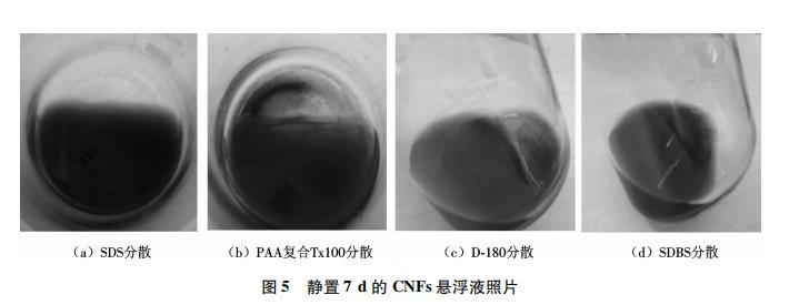 圖5為靜置7d后4種表面活性劑分散的CNFs懸浮液的狀態.可以看出,采用SDS分散的CNFs懸浮液中未見明顯沉淀,SDBS分散的懸浮液中稍有沉淀,PAA復合Tx100分散的懸浮液和D-180分散的懸浮液中均能觀察到明顯的黑色沉淀物.