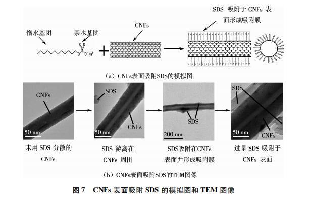 CNFs能夠在水性體系中實現分散是由于表面活性劑分子在水溶液中會吸附或包裹在CNFs的表面,這種吸附或者包裹作用不會破壞CNFs的結構與形