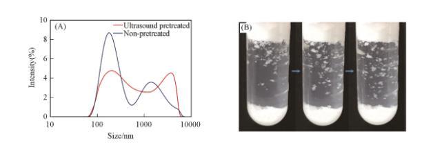 值得注意的是,如果粒子首先用超聲波分散在液體中,然后以相同的方式振蕩,則顆粒產(chǎn)生的泡沫高度有所下降[圖6(A)]。因此對比了振蕩和超聲波處理后的顆粒在液體中團聚體的粒徑大小。采用動態(tài)光散射儀間接表征了顆粒在液體中的團聚情況[圖7(A)]。可以看出,振蕩后的液體中有較多物質(zhì)的粒徑大于單個顆粒直徑,而且粒徑分布很寬。這證明液體中存在明顯的顆粒團聚體。由于顆粒本身存在巨大的表面能,多數(shù)顆粒在空氣中已經(jīng)自發(fā)團聚。顆粒在液體中大多也以團聚體的方式存在。少量空氣被密封在浸沒于油相中的顆粒團聚體內(nèi)部,這部分不與外界聯(lián)通的空氣提供了額外的壓力,進而阻止了進一步滲透。這種顆粒團聚體表面同樣形成了由Cassie-Baxter方程描述的復(fù)合表面,該復(fù)合表面的形成保護了構(gòu)成團聚體的顆粒不被完全潤濕,并使團聚體表面具有合理的疏油性(cosθ_CB的值接近0),從而在熱力學(xué)上團聚體便于發(fā)生吸附。而溶液經(jīng)超聲波處理后顆粒被潤濕,團聚體被破壞使尺寸變小,并且均勻分布在溶液中。圖6(B)顯示了在經(jīng)超聲波處理后的表面張力測試數(shù)據(jù),同樣表明團聚體被破壞后,被潤濕的顆粒不再傾向于吸附在表面上。