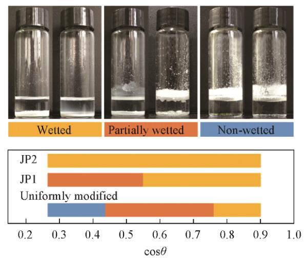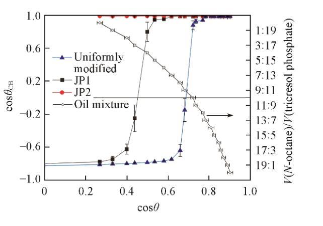 放置在靜止液體表面的顆粒的潤濕行為由圖5示出。隨著液體表面張力的增加,從光滑的氟碳鏈覆蓋的表面獲得的cosθ值同時增大,液體頂部的表面出現(xiàn)明顯的不溶顆粒。這種顆粒不潤濕的情況與顆粒形成粗糙表面測量的結(jié)果具有相關(guān)性。干燥的顆粒以蓬松狀態(tài)直接向油相傾倒,如果在油相表面能形成足夠強壯的、由顆粒組成的亞穩(wěn)態(tài)Cassie-Baxter狀態(tài),那么疏油表面將會形成,并阻止其它顆粒接觸油相,宏觀表現(xiàn)為顆粒不潤濕。相反,如果油相表面由顆粒組成的亞穩(wěn)態(tài)Cassie-Baxter狀態(tài)魯棒性不足,在手動振蕩或重力作用下,顆粒或顆粒團聚體接觸油相并浸沒在油相中。亞穩(wěn)態(tài)魯棒性與顆粒表面材料潤濕角密切相關(guān),即不同類型的顆粒具有明顯不同的潤濕轉(zhuǎn)折點。JP1潤濕性轉(zhuǎn)折點位于均勻修飾顆粒右側(cè),JP2沒有發(fā)現(xiàn)潤濕轉(zhuǎn)折點。這與顆粒上接枝的烷烴鏈數(shù)量有關(guān)。JP2上盡管存在氟碳鏈,但由于烷烴鏈覆蓋的面積太大,使顆粒整體表現(xiàn)出強烈的親油性。