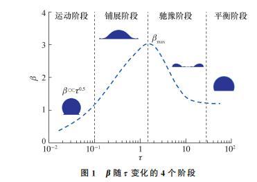 根據(jù)β隨τ變化情況,液滴碰撞分為運(yùn)動(dòng)、鋪展、弛豫和平衡4個(gè)階段,如圖1所示。在運(yùn)動(dòng)階段(τ<0.1),慣性力占主導(dǎo)地位,液滴上部仍保持球狀,下部鋪展成楔形邊緣,文指出該階段可忽略流體性質(zhì)影響,β隨τ呈指數(shù)上升,即β∝τb,其中指數(shù)b介于0.45到0.57之間,一般取b=0.5;在鋪展階段,受黏性力或毛細(xì)力的主導(dǎo)作用,β逐漸增至βmax,然后液滴開始回撤收縮,進(jìn)入馳豫階段;在平衡階段,液滴可能穩(wěn)定鋪展,也可能發(fā)生反彈,或者碎裂飛濺。本文主要針對(duì)運(yùn)動(dòng)階段和鋪展階段進(jìn)行研究。