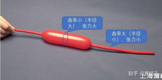 氣球內(nèi)部的氣體壓力處處相等,但是,接觸過這種氣球的人都有一個經(jīng)驗,就是粗的地方繃得緊,而細(xì)的地方繃得就不那么緊。如上圖所示,繃得緊的地方和繃得松的地方,產(chǎn)生的壓力差是相等的,但是他們的曲率是不相等的:曲率越大,同樣的張力所能產(chǎn)生的壓力差就更大。