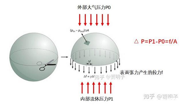 而這里有一件非常關(guān)鍵的事請,就是由于表面張力的存在,彎曲的表面就會在兩側(cè)形成壓力差。就好像緊繃的氣球,其內(nèi)部壓力要高于外部的壓力。這種壓力差來自哪里?當(dāng)然就是氣球皮膜緊繃的張力。由于氣球的彎曲表面,使得其張力最終表現(xiàn)為內(nèi)部壓力的升高。