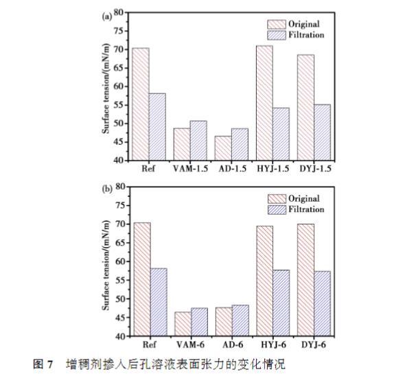 相同摻量下,DYJ的黏度最高,其次是HYJ,VAM和AD黏度在低摻量下接近,摻量達(dá)到0.10%之后,VAM黏度高于AD;VAM和AD的黏度隨著摻量的提高緩慢增大,而HYJ和DYJ溶液的黏度隨摻量的提高迅速提高,尤其是DYJ的增長幅度更為顯著??傮w來看,增稠劑分子量越大,相同摻量時溶液的黏度越高。從表面張力的結(jié)果來看,相同摻量下,HYJ溶液的表面張力最高,其次是DYJ,VAM和AD的表面張力顯著低于其他兩種增稠劑,且AD略微高于VAM.