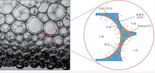 泡沫是一種熱力學不穩定的膠體體系,其中氣體分散在表面活性劑穩定的連續液相中,可以自發破裂。圖1顯示由表面活性劑形成的典型泡沫結構。提高CO2泡沫的穩定性具有挑戰性,因為在高壓儲層條件下,CO2更易溶于水,溶解的CO2會引起泡沫的團聚。